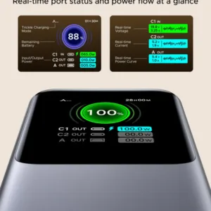 🧠 Smart Power & Display – Digital display shows battery level, voltage/current, and output power for each port.