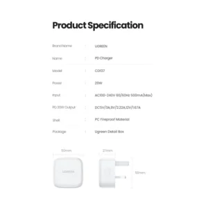 The UGREEN 20W Type-C PD Fast Charging Adapter UK (White) – CD137 is a high-performance charging solution designed for fast and efficient power delivery. With support for Power Delivery 3.0 and Quick Charge 4.0, 3.0, and 2.0, this charger provides safe and reliable charging for your devices. Its compact and travel-friendly design ensures convenience, making it an excellent choice for home, office, or on-the-go use.