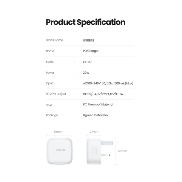 Why Choose UGREEN 20W Type-C PD Fast Charger UK (White) – CD137?