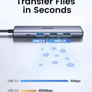 The UGREEN CM478 5-in-1 Type-C Multifunction Adapter is a versatile and compact hub designed to expand your USB-C device’s connectivity. With multiple ports, including USB 3.0, USB 2.0, HDMI, and Power Delivery (PD), this adapter is perfect for seamless data transfer, high-resolution video output, and fast charging. Its aluminum alloy and ABS construction ensures durability while maintaining a sleek and lightweight design.