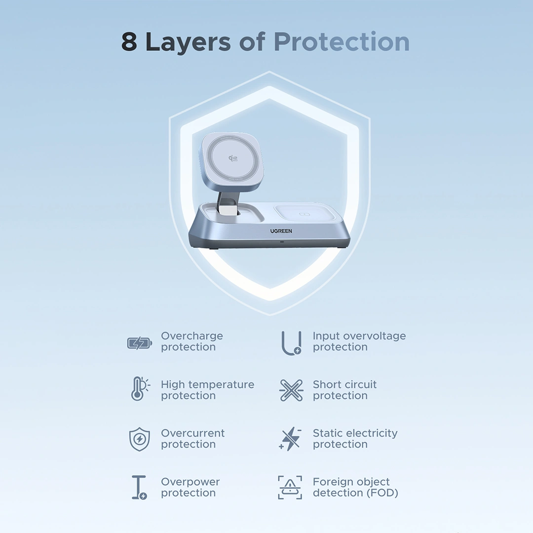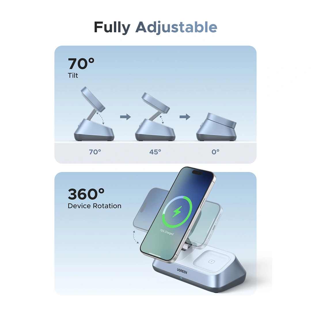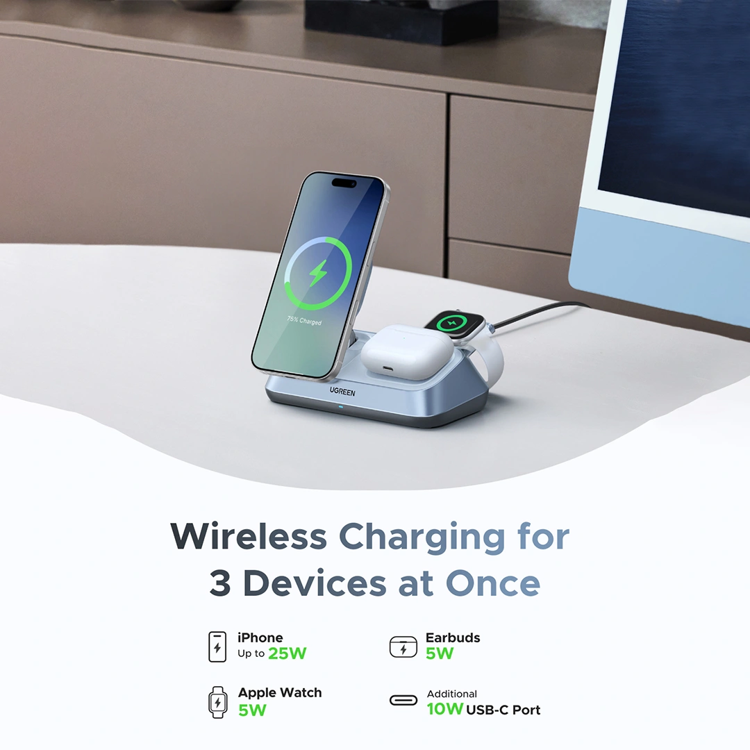 Elevate your charging setup with the UGREEN MagFlow 3-in-1 Magnetic Charger — a sleek, magnetic desktop stand that powers three devices at once: an iPhone (or other MagSafe / Qi2-enabled phone), AirPods (or other Qi wireless earbuds), and an Apple Watch.